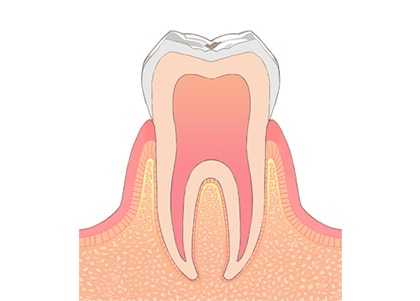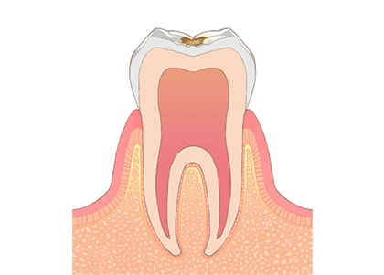 細菌の酸で歯が溶けていくと小さな穴を開けていきます。虫歯がエナメル質に限局している状態をエナメル質虫歯と呼びます。エナメル質には痛覚がないので痛みを感じることはありません。また、エナメル質虫歯では虫歯の穴を開けていくと中に広がっていることが多く「治療をしてみたら意外と大きかった」ということが多いです。