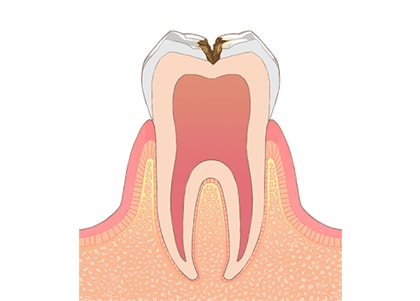エナメル質の下層に存在する象牙質に虫歯が進行した状態が象牙質虫歯です。象牙質は神経と交通しているので痛みが出やすいです。歯が痛いという患者様の多くは象牙質虫歯です。冷たいものだけでなく甘いものを食べてもしみることがあります。